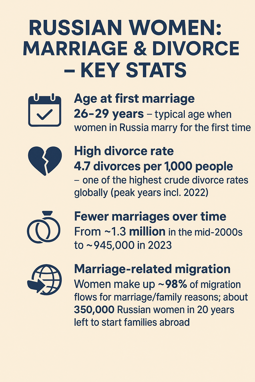 - Women who are open not only to dating but also to marriage migration: moving abroad for family reasons rather than purely for work or study. Academic work on marriage migration estimates that between 1993 and 2016, about 1.2 million Russian women left for permanent residence abroad, and experts believe roughly one third of them—around 350,000—migrated through marriage.